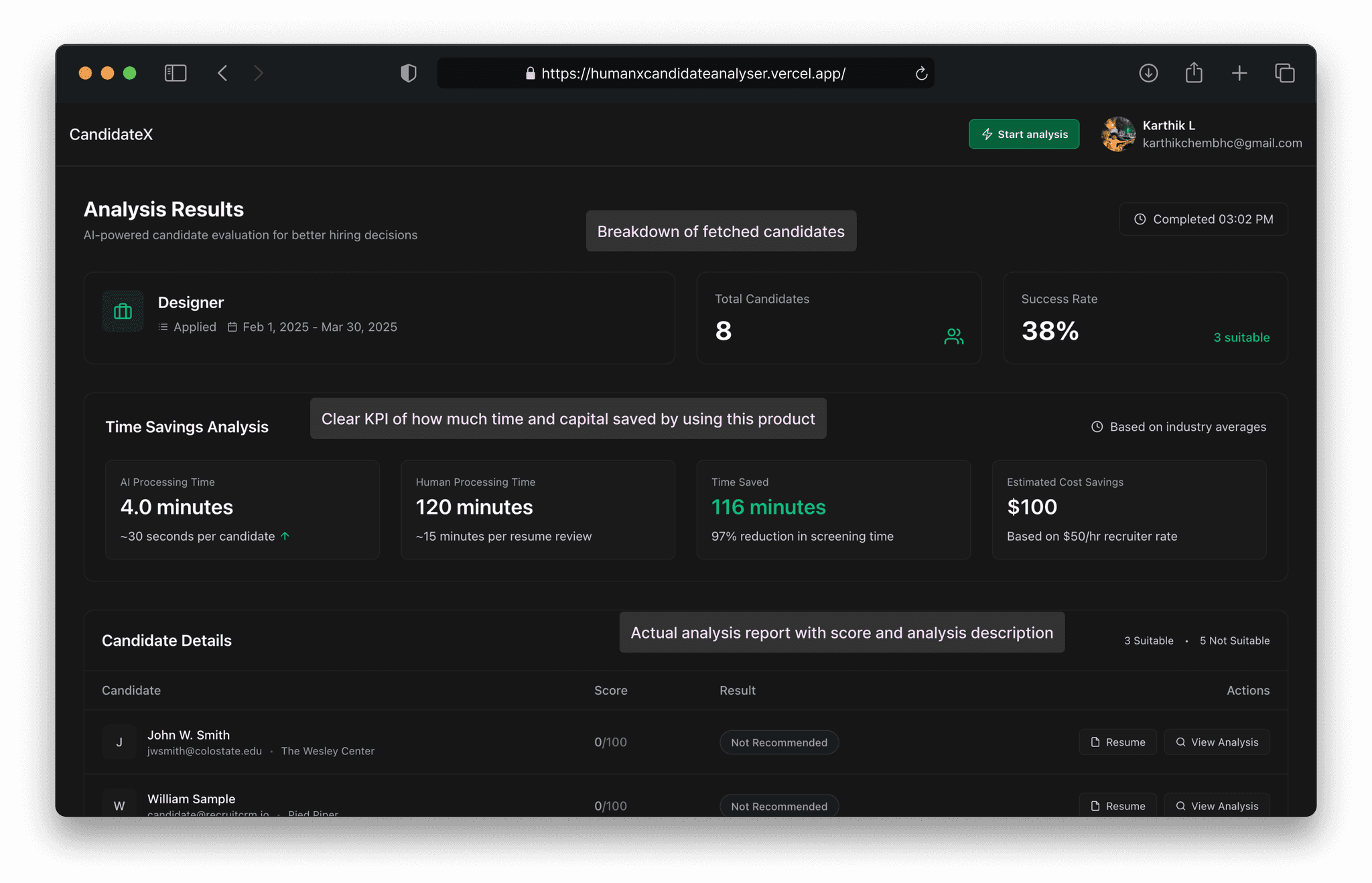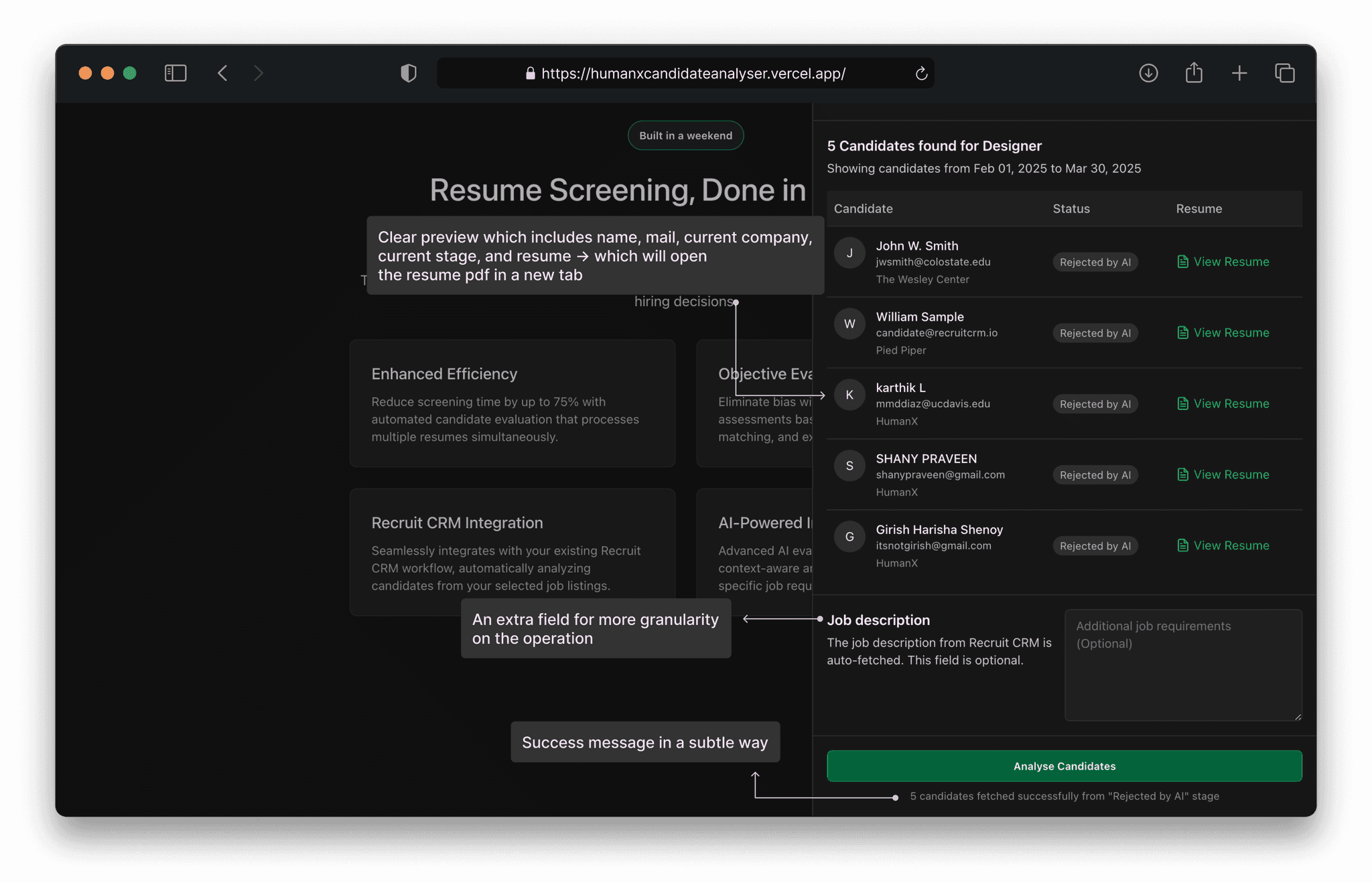 Unlike other products this doesn't demand you to be there right in front of the screen. The moment it finishes the analysis it automatically updates the stage status on the integrated app. In our case it's recruit crm — it moves all the analysed candidates to appropriate buckets. For e.g. Recommended by AI / Rejected by AI